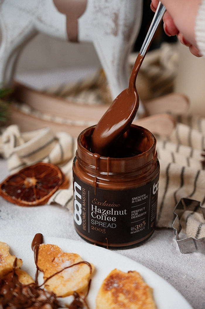 BAM namaz od kave i lješnjaka (200 g) sadrži najmanje 30 % odličnih prženih lješnjaka. Kombinacija paste od lješnjaka, aromatične kave i kremastog mlijeka daje izvrstan, kremasti namaz koji se odmah može uvrstiti u jelovnik. Može dati poseban okus doručku, užini ili večeri, a izvrsno funkcionira i kao dodatak desertima. Namaz ne sadrži palmino ulje, isto tako je i bez glutena, pa svatko tko izbjegava gluten može slobodno posegnuti za njim. BAM namaz od kave i lješnjaka idealan je za pripremu vrhunskih krema i mousseova. Može se dodati kao nadjev u kroasane, pite i druga peciva ili se jednostavno namazati na kruh i palačinke odnosno dodati sladoledu i voću.